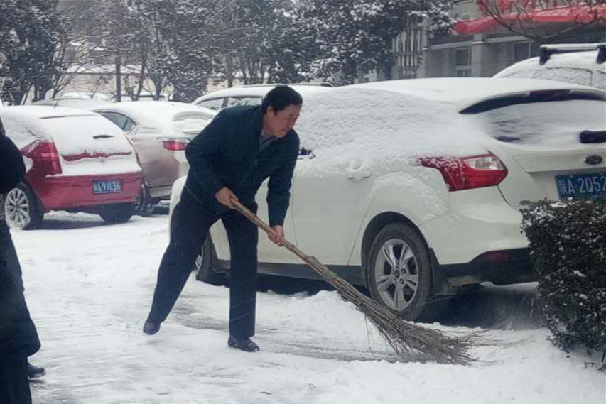 ? ? 上午8點未到,在隊領導帶領下,大家團結協作,不畏寒冷,頂著風雪,拿起掃把、雪鏟、推車對路上的積雪和結冰進行清掃。忙碌的身影構成了一道亮麗的風景線。雖然室外溫度很低,但大家勞動的熱情和團結的力量讓這個冬日變得格外溫暖。